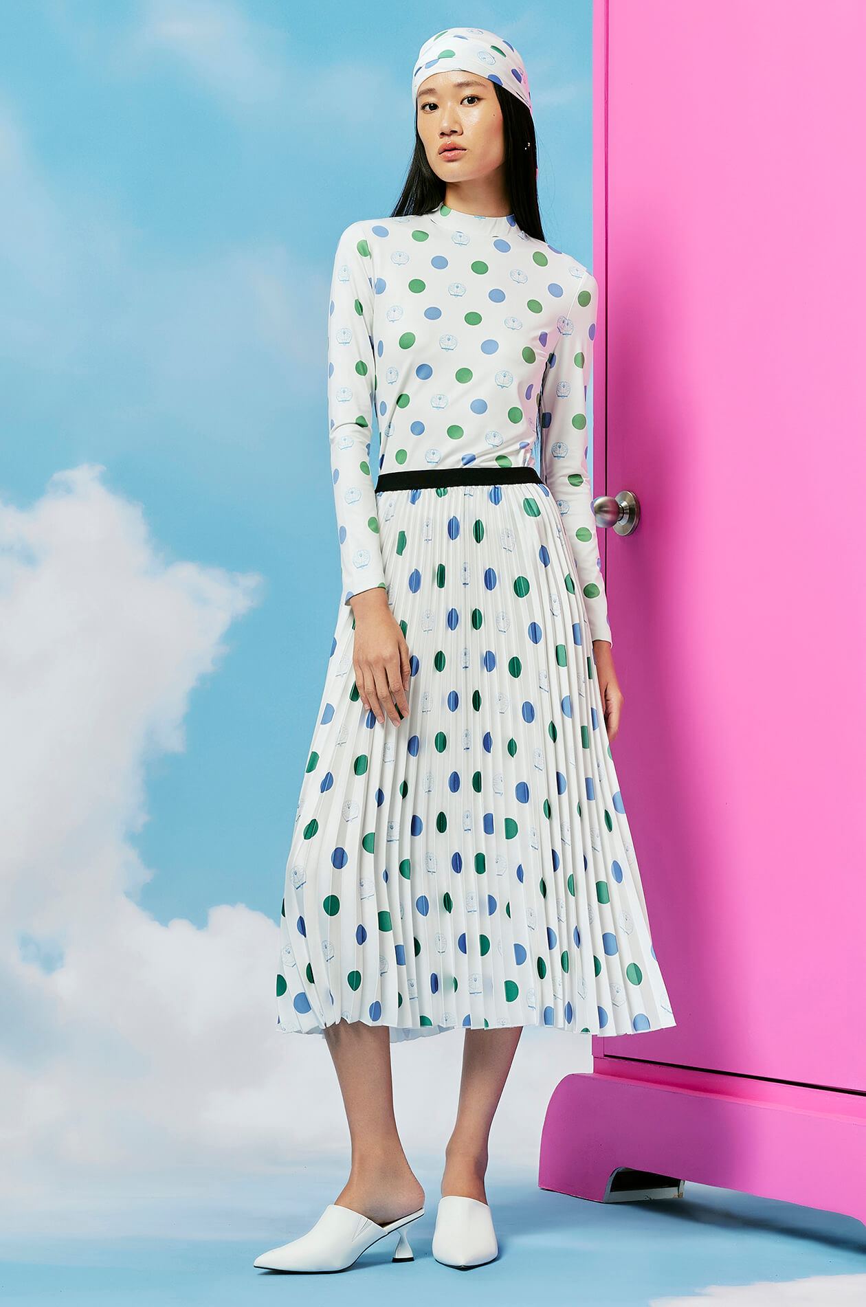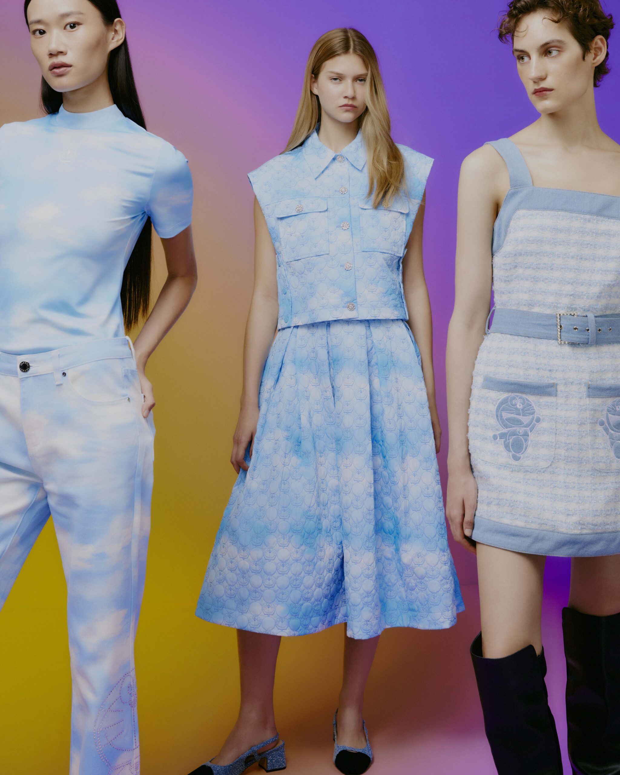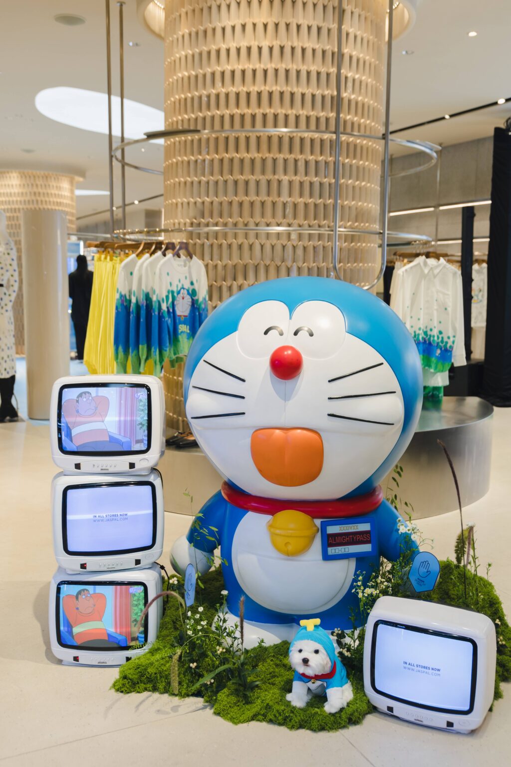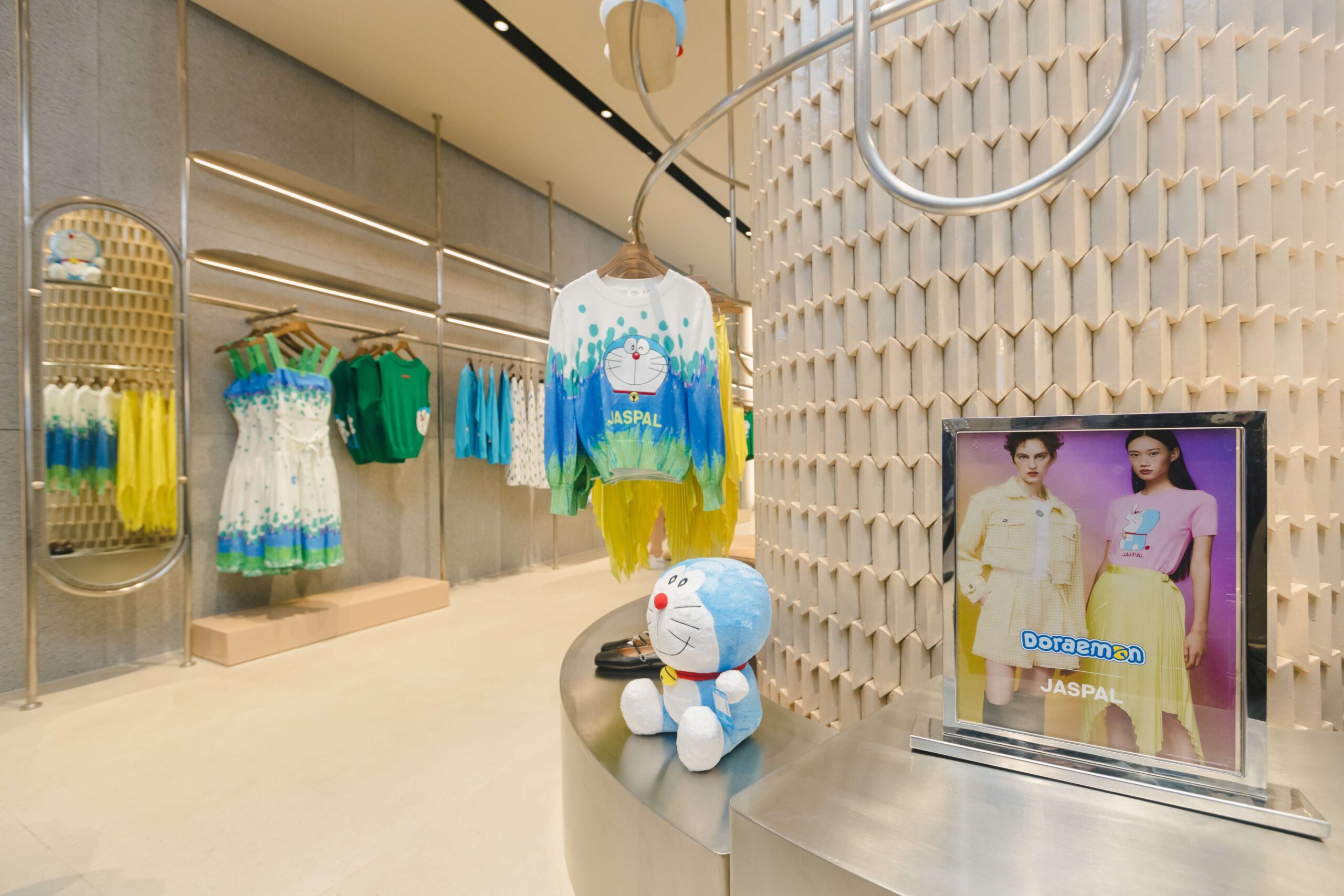 ไอเทมที่ห้ามพลาด! สำหรับผู้หญิง ชุดเข้าเซ็ตลายท้องฟ้าที่ JASPAL จัดทำขึ้นมาพิเศษด้วยเทคนิคการพิมพ์ลวดลายโดราเอมอนลงบนเนื้อผ้า มาพร้อมเสื้อและกระโปรงทรงเอ และอีกหนึ่งชุดเข้าเซ็ตผ้าทวีตสีฟ้าที่มีโดราเอมอนตรงบริเวณกระเป๋าด้านหน้าของเดรสและด้านหลังแจ็คเก็ต, เสื้อลาย Polka dot สีเขียว ฟ้า พร้อมใบหน้าโดราเอมอนแมทช์กับกระโปรงที่เข้ากันเป็นเซ็ต สำหรับผู้ชายมีเสื้อเชิ้ตลายโดราเอมอนที่มาพร้อมความคลูและน่ารัก หรือจะเป็นชุดเข้าเซ็ตเดนิมกางกางขาสั้นความพิเศษคือการปักลายโดราเอมอนลงบนเนื้อผ้ายีนส์