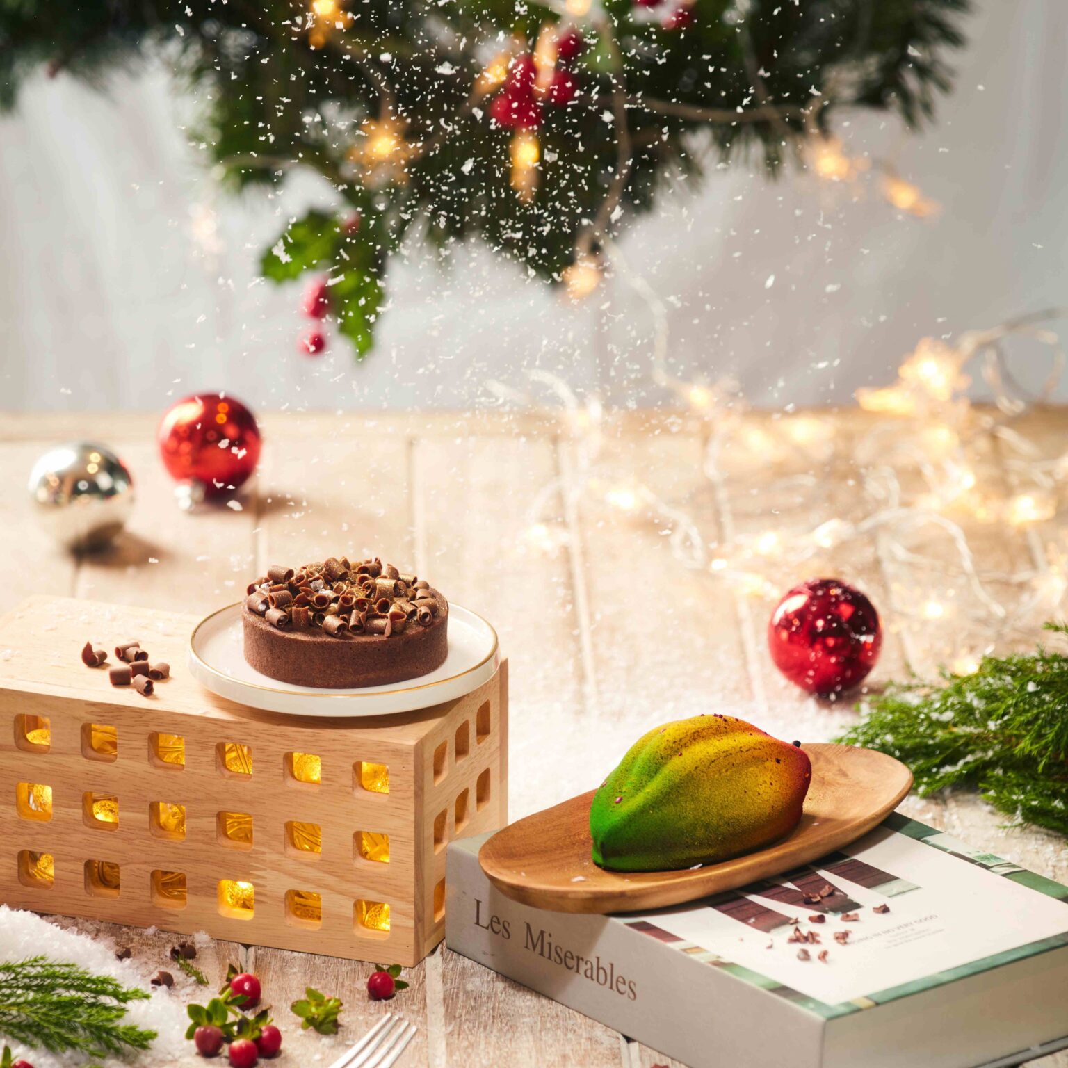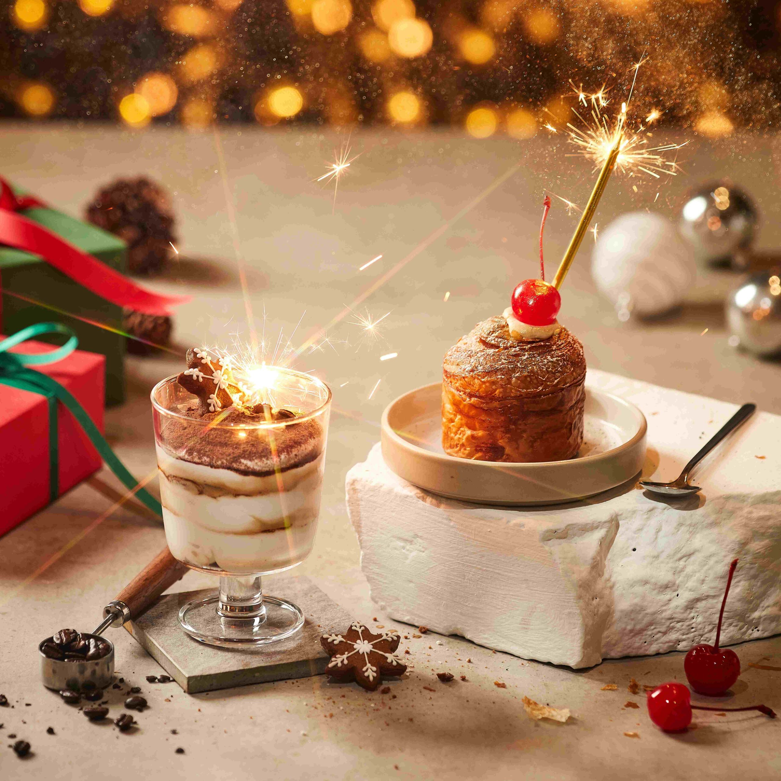 (9) A la Minute Tiramisu เค้ก Tiramisu ที่ทำแบบสดใหม่แก้วต่อแก้ว โดยสามารถเลือกระดับของกาแฟที่ชอบได้ มีให้เลือก 3 ระดับ อ่อน กลาง และเข้ม ความพิเศษของเมนูนี้จะเลือกใช้ Lotus Biscoff เพื่อเพิ่มความอร่อยและความกรุบกรอบมากยิ่งขึ้น และ Digestive Biscuit ซึ่งจะช่วยเพิ่มรสสัมผัสและความหอม พร้อมสร้างบรรยากาศคริสต์มาสสุดน่ารักให้กับเมนูนี้ด้วย Ginger bread รูปดาวที่วาดเป็นลาย Snow flake และเบเกอรีเมนูสุดพิเศษเมนูสุดท้ายของเทศกาลคริสต์มาสนี้คือ (10) I’m Choc! สำหรับ Chocolate Lover โดยเปลือกทาร์ตทำจากเนยสดที่มีความกรุบกรอบ ด้านในทาร์ตสอดไส้ด้วย Chocolate Mascarpone Cheese Mousse ซึ่งกลิ่นของ Mascarpone Cheese ช่วยเพิ่มของการรับรู้ทำให้รู้สึกถึงความเข้มข้นและกลิ่นหอมของตัวทาร์ตมากยิ่งขึ้น โดยด้านบนจะเคลือบด้วย Chocolate Ganache และตกแต่งด้านบนด้วย Couverture Chocolate Curls ซึ่งช่วยเพิ่มสัมผัสของความกรุบกรอบ ปิดท้ายด้วยท้อปปิ้งพ่นทองให้ดูเป็นประกายสวยงาม