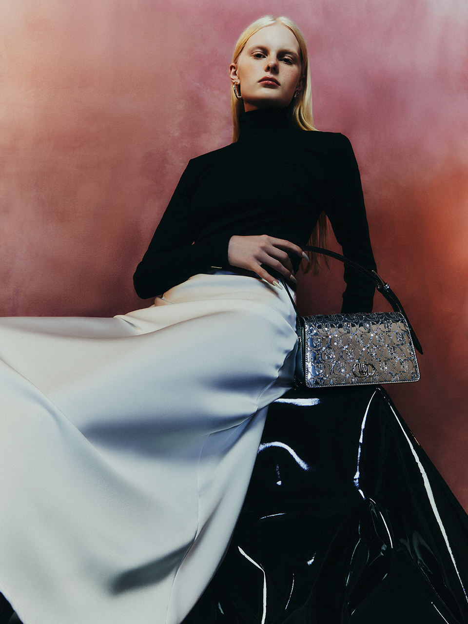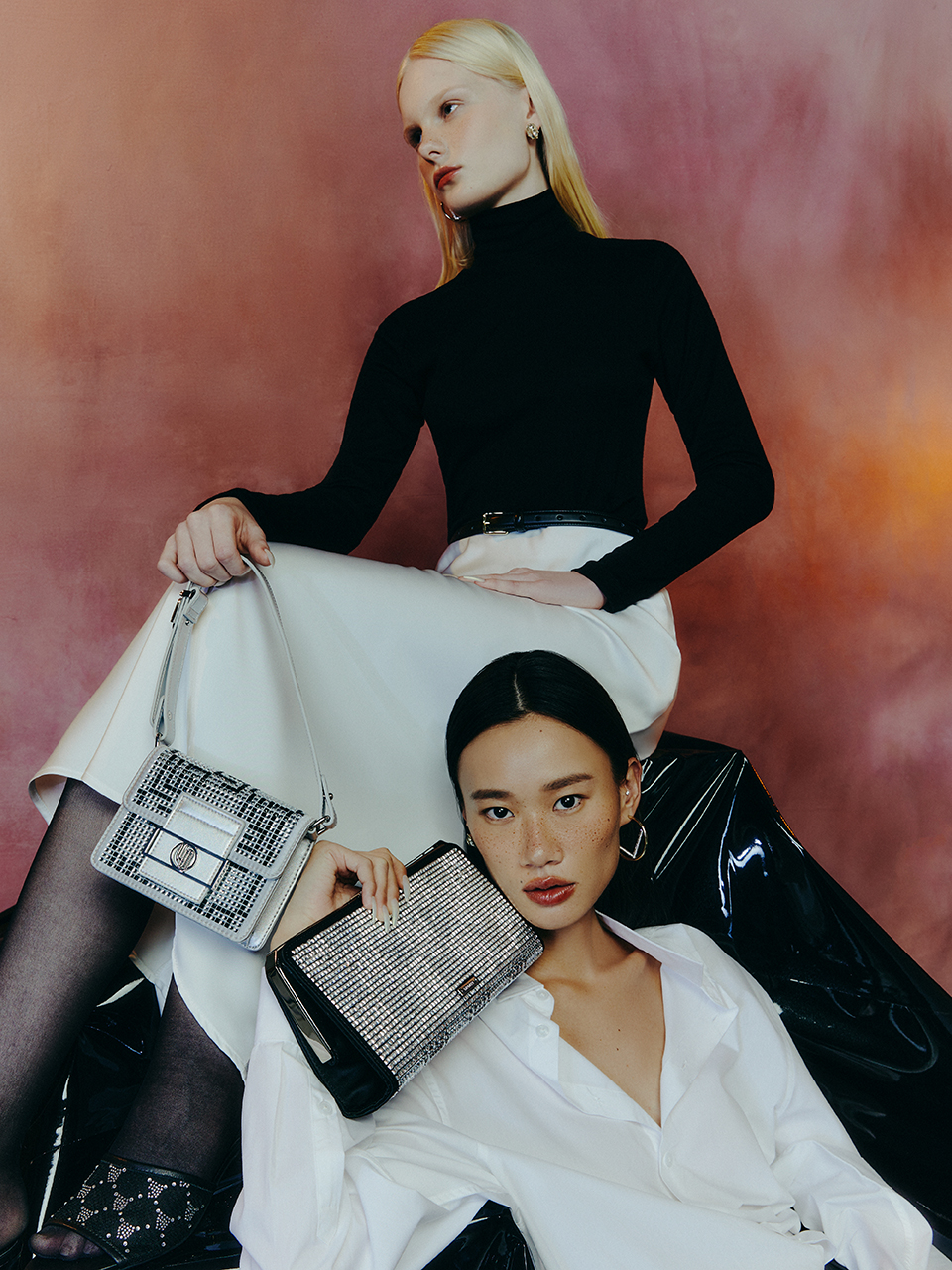 ต่อมา JUIETTA กระเป๋าสะพายไหล่ทรงสี่เหลี่ยมผืนผ้า ไอเทมที่แฝงความงามระยิบระยับของกลิตเตอร์ไปจนถึงเลื่อมปัก แถบปิดกระเป๋าแต่งฮาร์ดแวร์โลโก้ Infinite เพิ่มดีกรีความหรูหรา มีให้เลือกทั้งสีเรียบและแบบกลิตเตอร์สีเงินและสีทอง และกระเป๋าสะพายสายโซ่สี่เหลี่ยมจัตุรัสใบกะทัดรัดที่ปักเลื่อมสีชมพูอ่อนทั่วทั้งใบ