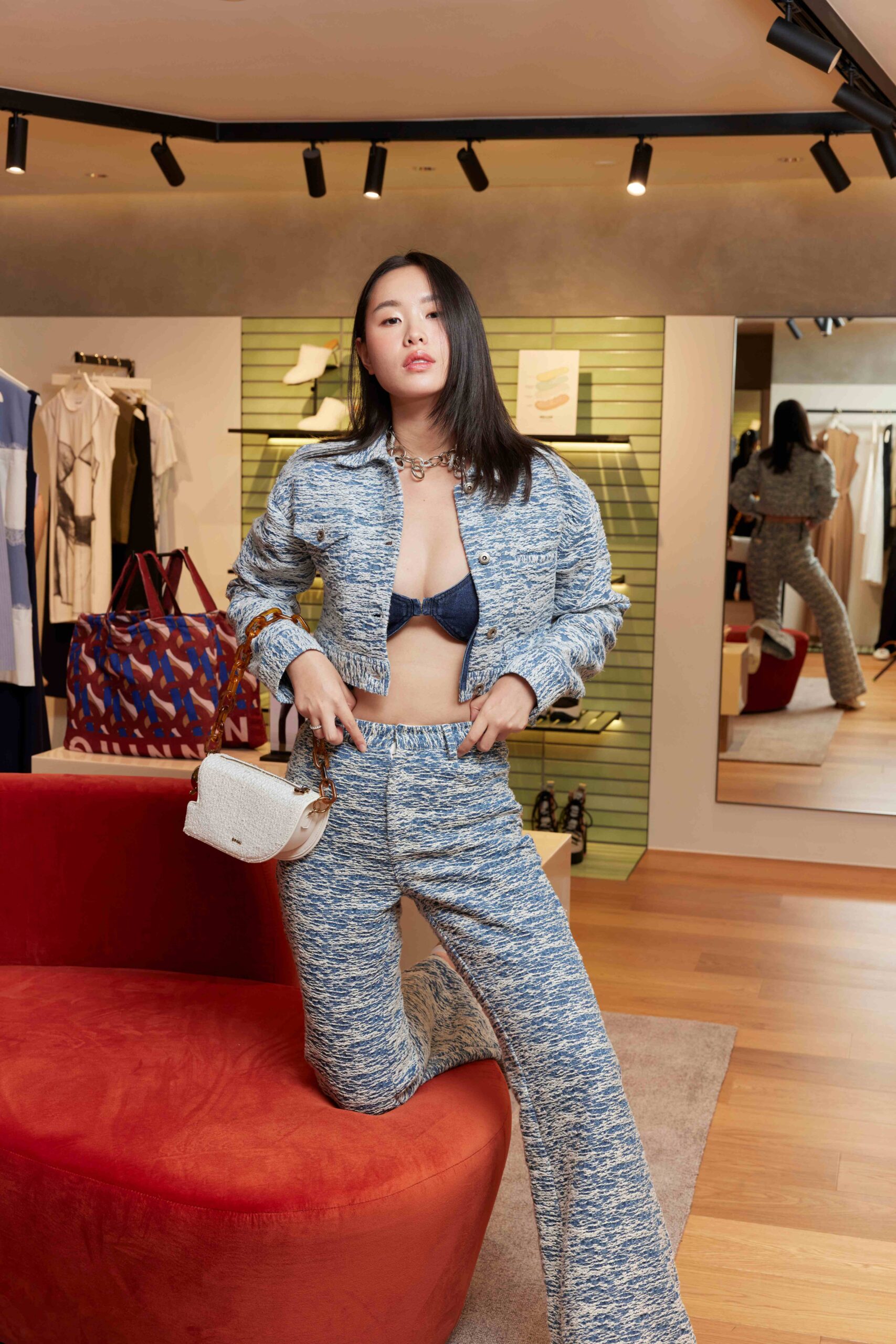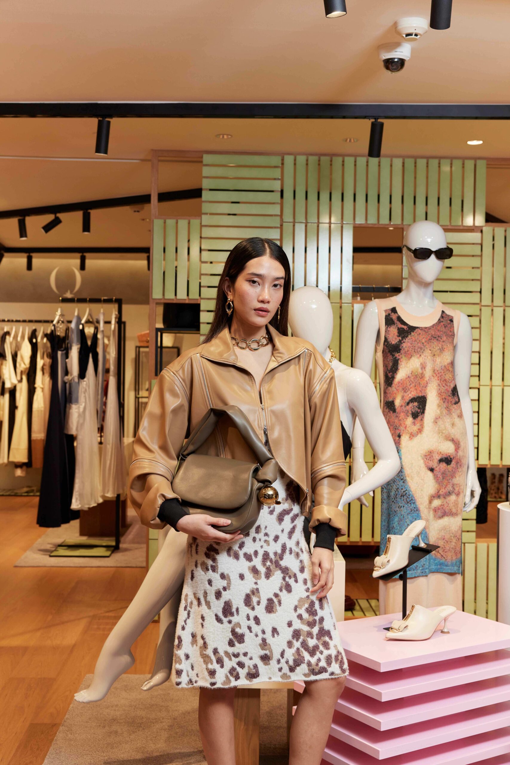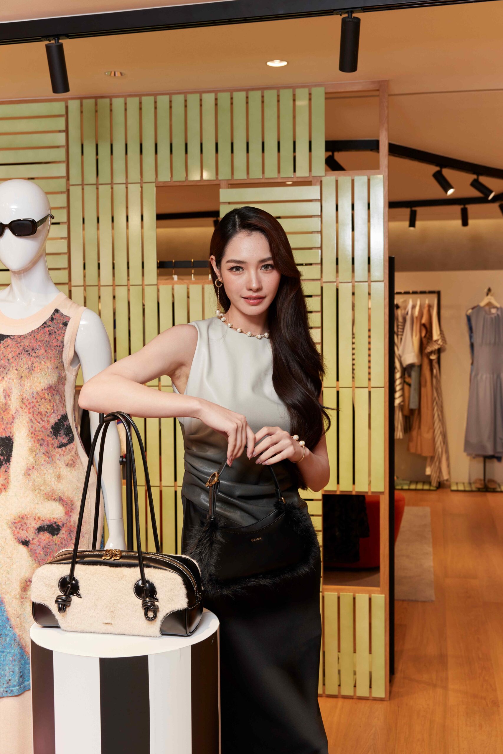นอกจากนี้ ยังเพิ่มดีเทลลายทางที่สื่อถึงเส้นของมิติที่คู่ขนานถูกนำมาฟีเจอร์บนเสื้อเปิดไหล่ดีไซน์คลาสสิค และเดรสสั้นคอวีที่สามารถสวมใส่ไปในวันทำงานหรือวันพักผ่อนได้ แถบลายทางที่ด้านข้างของกางเกงขายาวทรงทิ้งตัวช่วยเพิ่มไดนามิคให้กับมูฟเมนต์ ชุดเซ็ตเสื้อแขนยาวและกระโปรงในเนื้อผ้ามีการใช้สีสันแบบคัลเลอร์บล็อคผสานกับลายเส้นตรงที่พาดผ่านเพิ่มดีกรีความชิค เช่นเดียวกับเดรสยาวแขนกุดคอกลมลึกที่โดดเด่นด้วยดีเทลเส้นตรงสีเขียวเป็นแนวยาว นอกจากลายทางแล้ว คอลเลกชั่นนี้ยังสร้างกิมมิกจากเทคนิกมัดย้อมไล่สีขาว-ดำบนหนังสังเคราะห์ที่เปลี่ยนให้ชุดเซ็ตเสื้อกั๊ก และกางเกงขาสั้นดูเท่ขึ้น รวมไปถึงการเล่นกับกราฟิกแบบ Pixel Art ที่นำเอาภาพของสถาปัตยกรรมและงานศิลปะอันคลาสสิกมาผสมกับความล้ำสมัยของโลก AI ดังที่ปรากฏบนชุดเดรสยาวแขนกุดที่ถือเป็นไอเทมมัสแฮฟที่พลาดไม่ได้
