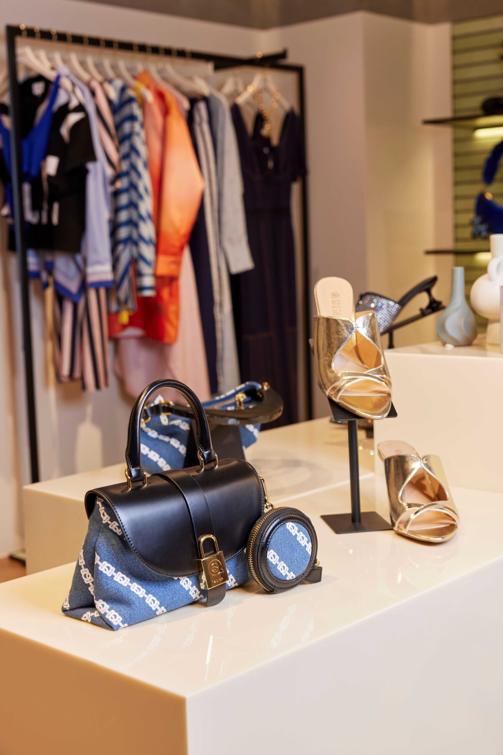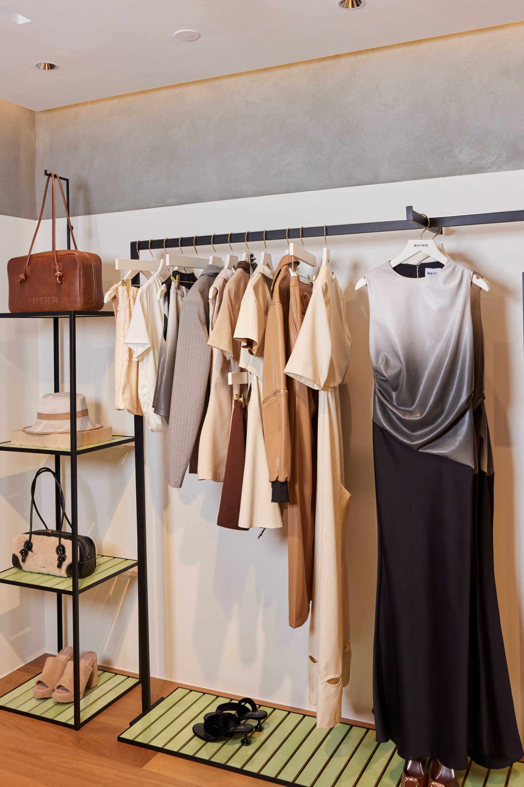 คอลเลกชั่นนี้ โดดเด่นด้วยการฮาร์ดแวร์โลหะและความอสมมาตรที่ดูลื่นไหล นำเสนอเป็นเค้าโครงชุดที่เล่นกับรูปทรงเรขาคณิต และความซับซ้อนที่ซ่อนอยู่ภายใต้ซิลลูเอ็ตที่ดูเรียบเท่ในแบบ QUINN ถูกยกระดับด้วยออร์นาเมนต์ชิ้นสำคัญ เช่น โลหะสีเงินและสีทองในรูปทรงที่งดงามดุจงานศิลปะ ชุดเดรสเกาะอกสีดำทรงดินสอ และจั๊มป์สูทเกาะอกขายาวเข้ารูปที่ให้ลุคเรียบโก้ ถูกเสริมแต่งด้วยความเย้ายวนและลื่นไหลของขอบเสื้อตัดเว้ากลางอกประดับด้วยออร์นาเมนต์สีทองอันโดดเด่น กระเป๋าถือสีดำขึ้นรูปมาพร้อมกับฮาร์ดแวร์โลโก้สีทองตัดกัน และกระเป๋าสะพายไหล่หนังนุ่มก็ยังถูกตกแต่งด้วยชิ้นงานลูกตุ้มสีทอง นอกจากนี้การเล่นกับความอสมมาตรของคอเสื้อและชายกระโปรงยังเข้ามา สื่อถึงโลกแฟชั่นที่ทุกอย่างเป็นไปได้